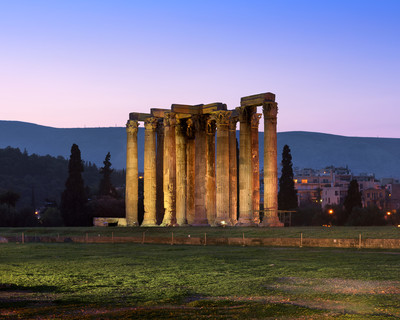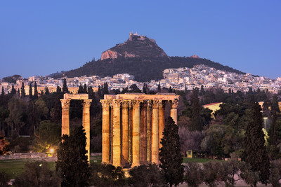 View of the Temple of Olympian Zeus and Mount Lycabettus in the Evening, Athens, Greece